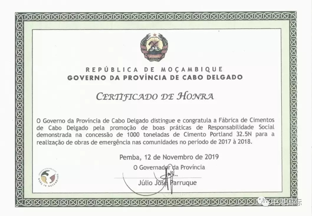 2019年11月28日,德爾加督省省長親自簽發,工商局局長親自向水泥廠頒發了莫桑比克政府對德爾加督水泥廠長期以來支持社會公益和公共事業發展的榮譽證書,以表示對水泥廠的感謝。?...