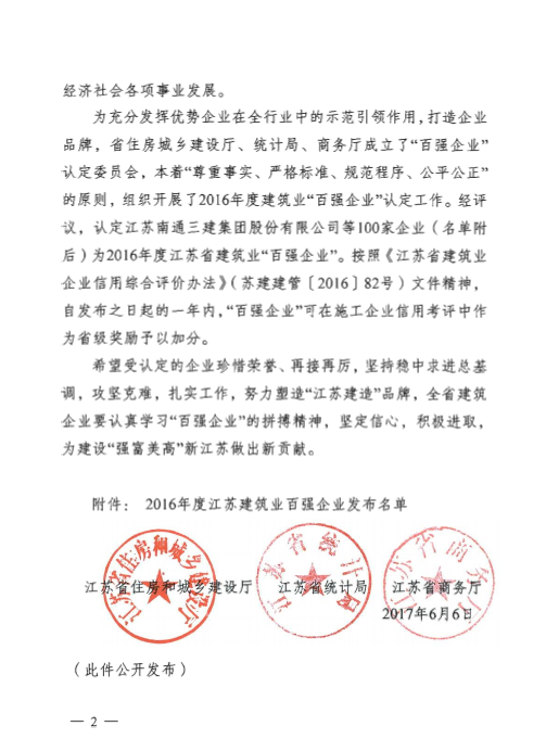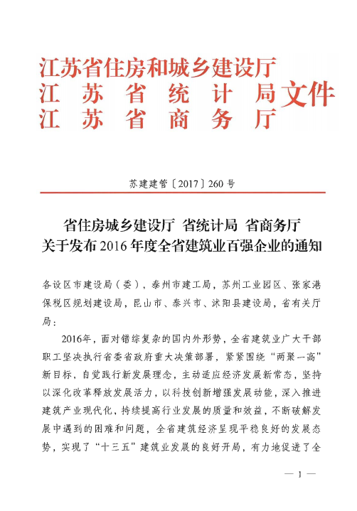 在江蘇省住房和城鄉(xiāng)建設(shè)廳、江蘇省統(tǒng)計局、江蘇省商務(wù)廳聯(lián)合成立的“2016年度百強企業(yè)”認(rèn)定委員會評選中,中港建設(shè)集團有限公司榮獲“2016年度江蘇省建筑業(yè)百強企業(yè)”榮譽稱號。