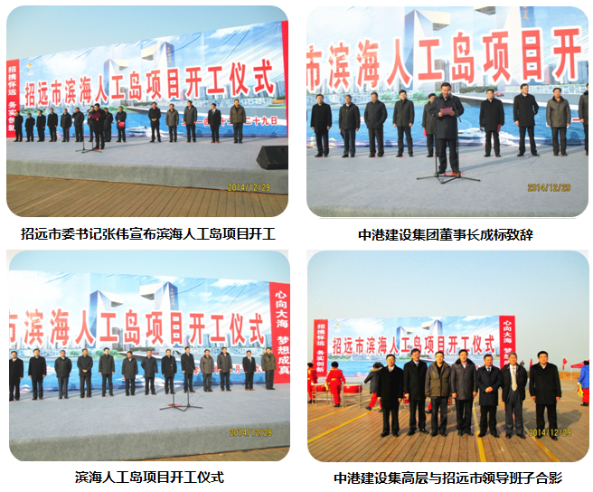 2014年12月29日10點08分,中港建設集團舉行了濱海人工島項目開工儀式。山東省招遠市領導張偉、王光耀、林建東、徐林宏、郝永平、趙曙光、馬立海等市級領導班子成員,中港建設集團成標董事長、秦高舉副董事長、崔大凡副總裁、黃波副總裁等集團高管,總承包單位中國技術進出口公司相關負責人,招遠市各鎮主要負責人,及人工島指揮部成員、各有關單位一同參加開工儀式。